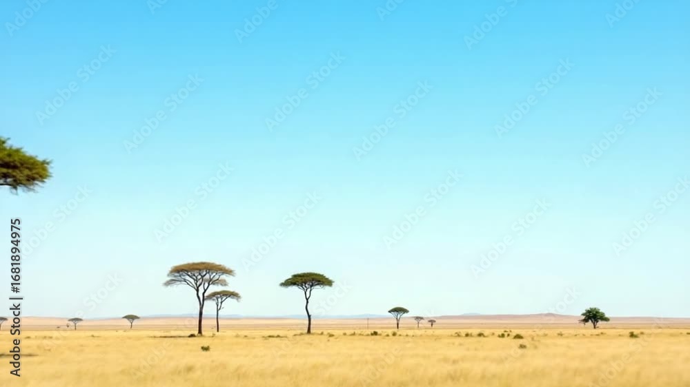 Vast African savanna landscape featuring sparse trees under a bright blue sky