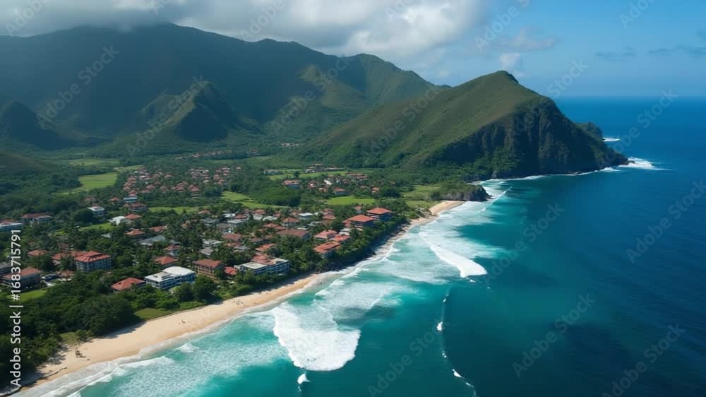 Scenic coastline with resorts and hotels, and breaking ocean waves on Nusa Ceningan, drone view