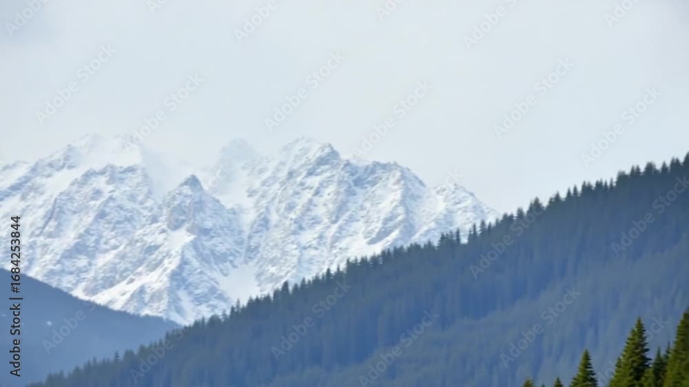 The sky is cloudy and the mountains are covered in snow