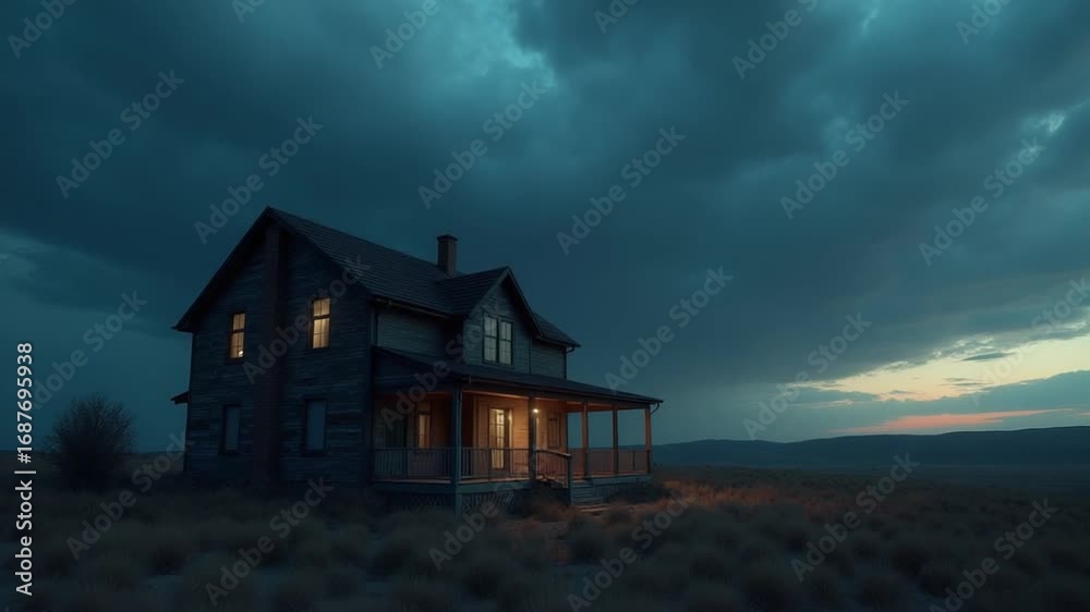 CGI Abandoned house in a deserted landscape under a stormy sky at dusk