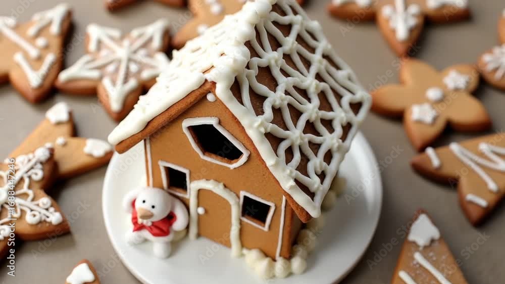 Gingerbread house with white icing. Christmas food. Gingerbread cookies. Top view