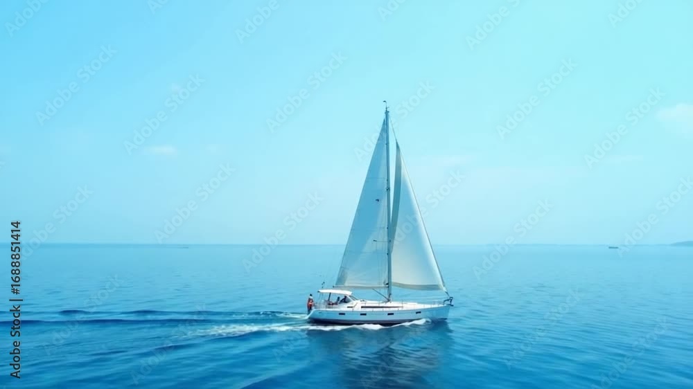 Aerial. Sailboat is sailing in the ocean with a clear blue sky in the background