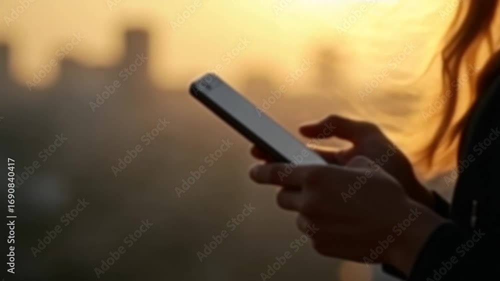 Female hands using smartphone against a blurred cityscape in the setting sun