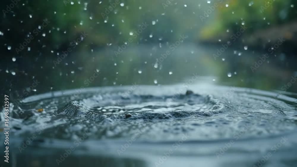 The gentle and calming sound of rainfall splashing softly on the surface of still water
