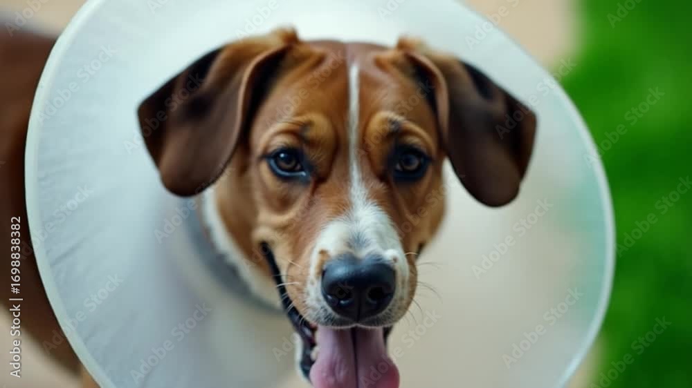 Dog in rehabilitation after surgery, wears plastic cone for protection
