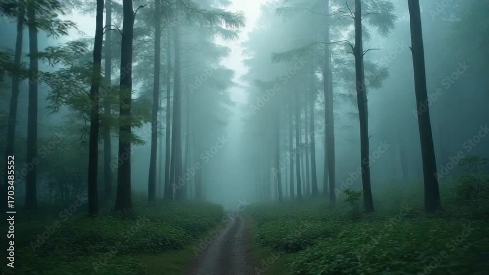 A misty forest with dense foliage and towering trees