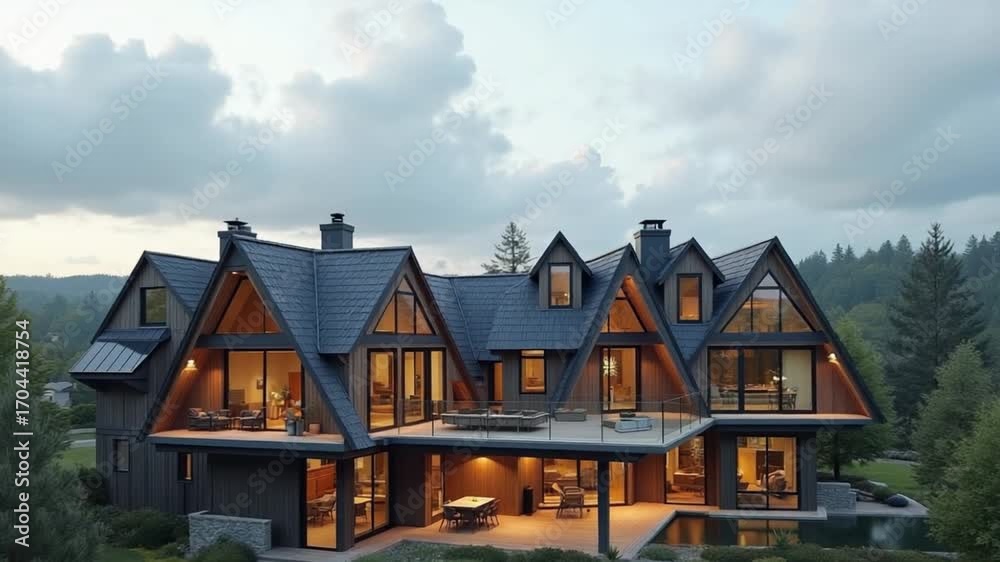 Aerial view Modern A-Frame Houses with Expansive Glass Windows Under Cloudy Sky
