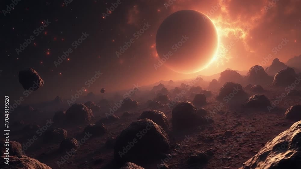 colossal field of hazardous asteroids stretching across a hazy galaxy