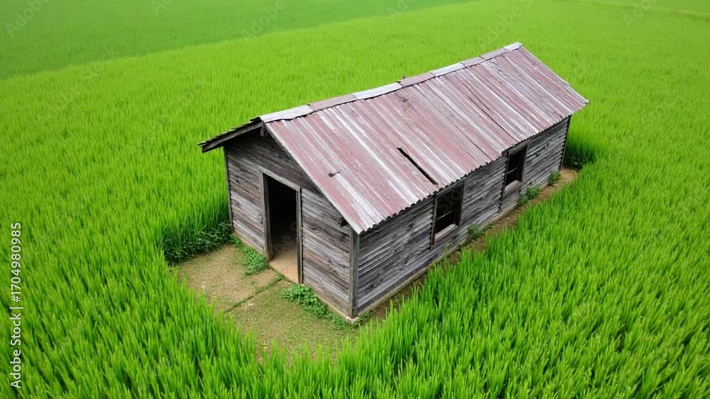 Aerial fly over abandoned wooden house at paddy field at Permatang Pauh, Penang.
