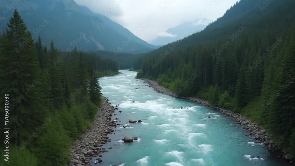 Flight over a mountain river. Shot on FPV drone. British Columbia, Canada.