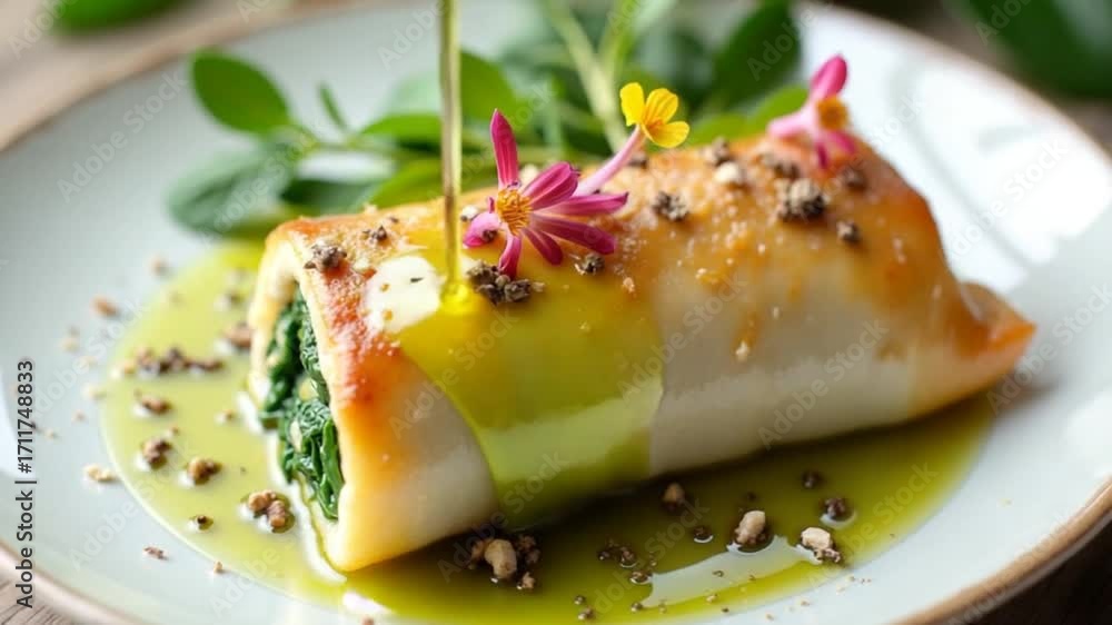 Chicken roll with spinach nicely served on a plate with greens, flower decorations and green oil