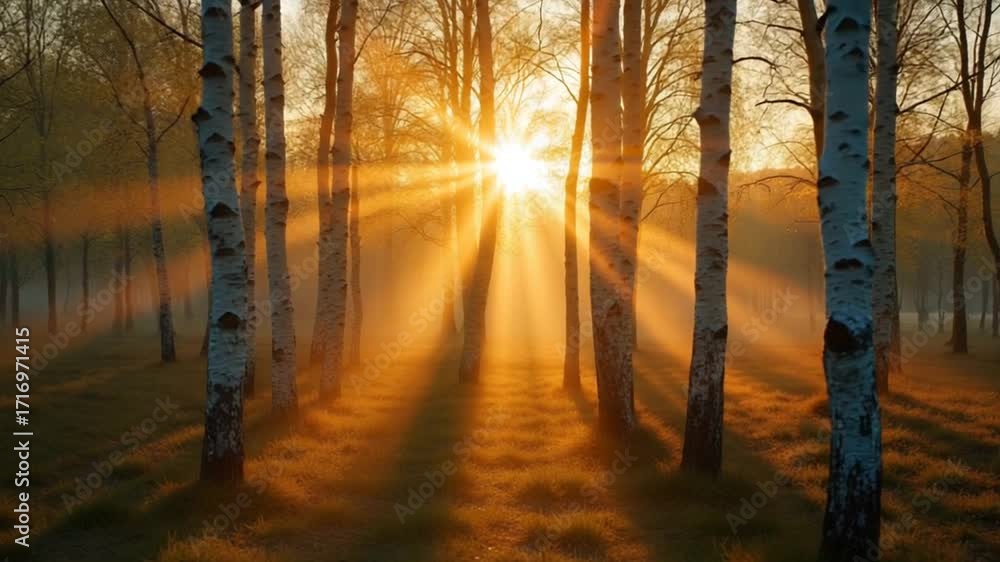 Sunrise or sunset in a spring birch forest with rays of sun shining