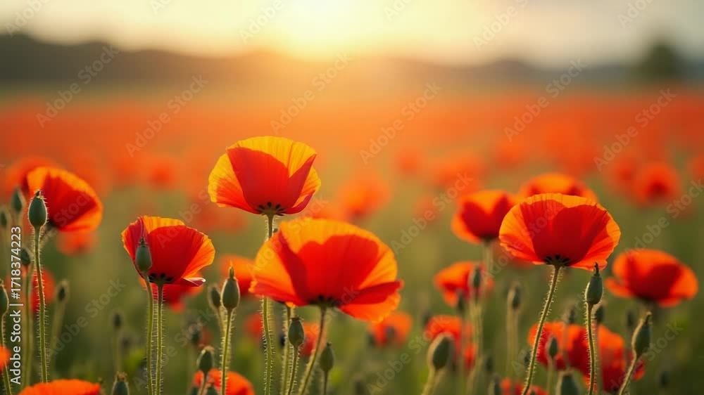 Flowering poppy field in sunny day, spring time. Wild red flowers. Aerial drone view.