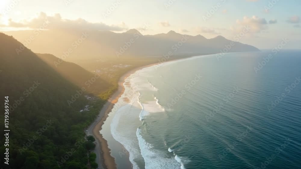 Coastline with quiet ocean, mountains and evening sunlight at North Bali, drone view