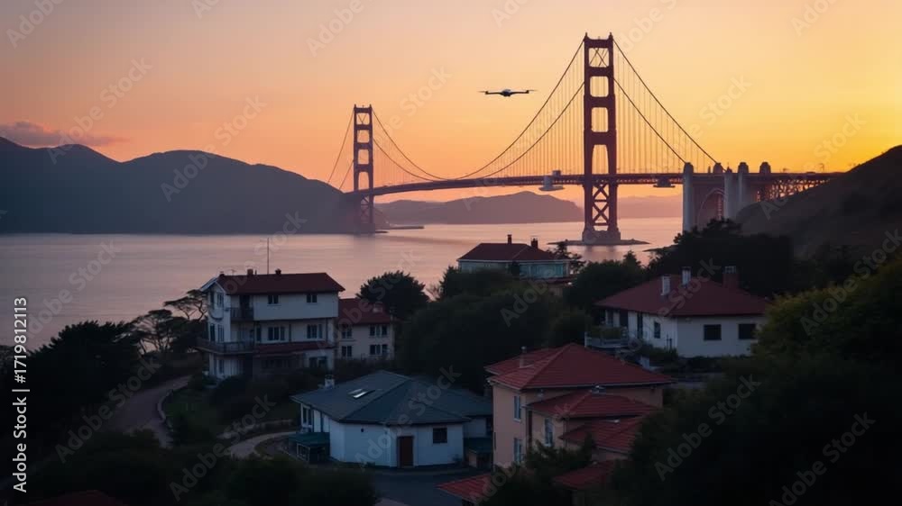 Drone flight between houses overlooking the Golden Bridge in the evening