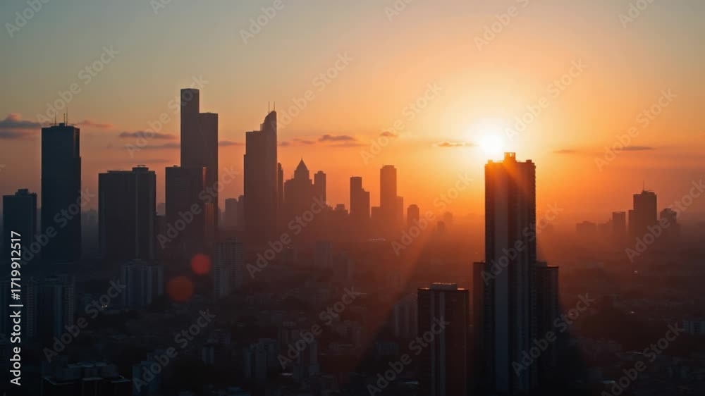 city skyscrapes with lense flairs at sunset