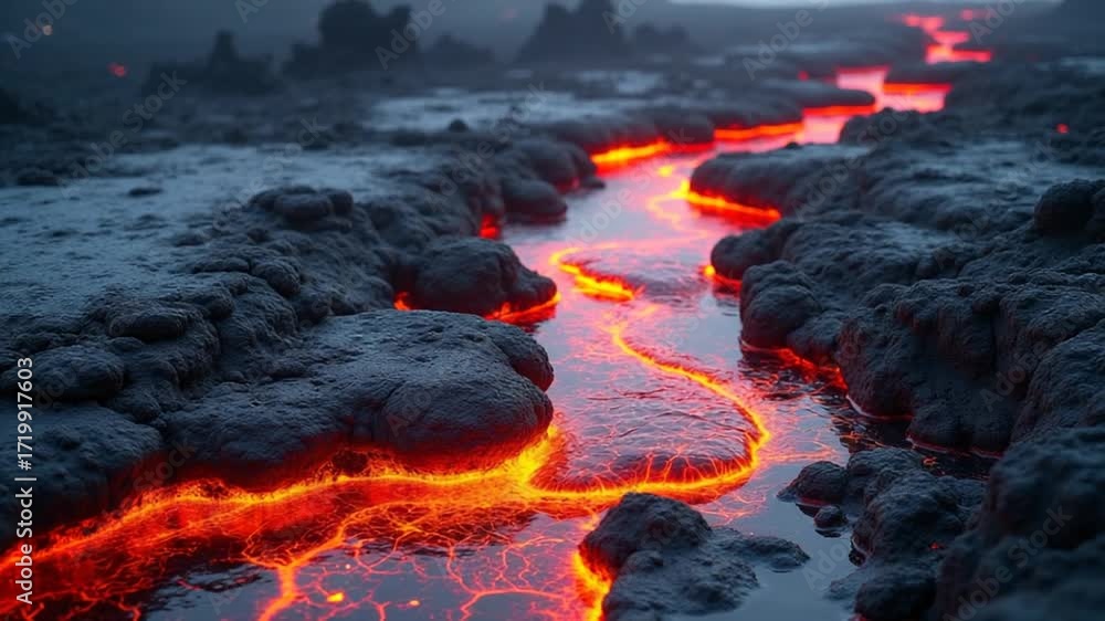 Red Orange vibrant Molten Lava flowing onto grey lavafield and glossy rocky land