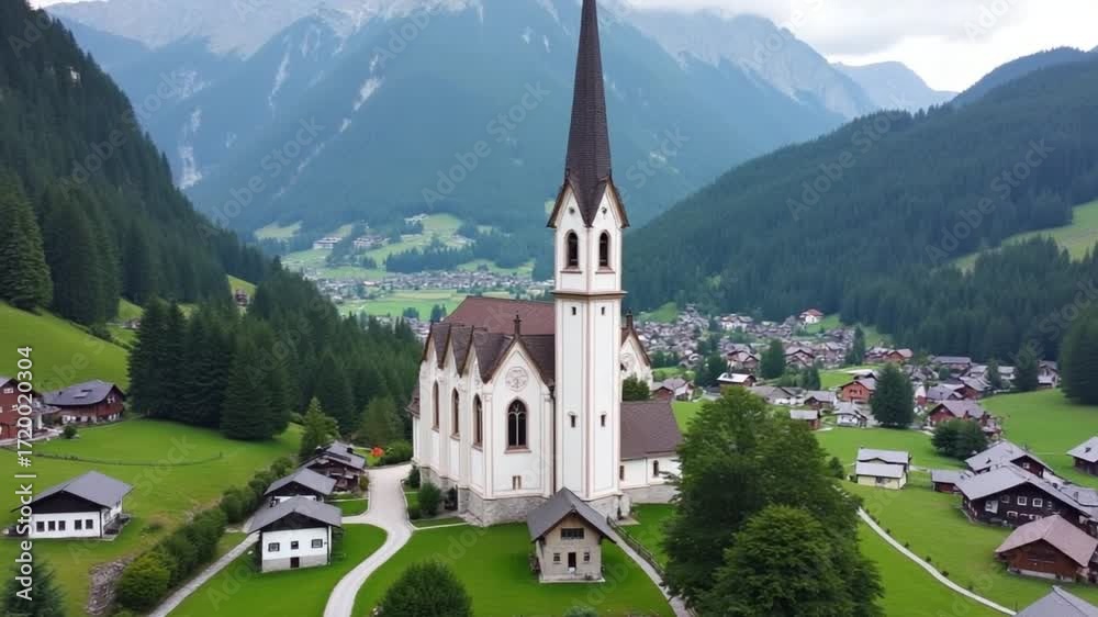 FPV aerial flight around the church and houses in Lauterbrunnen, Switzerland