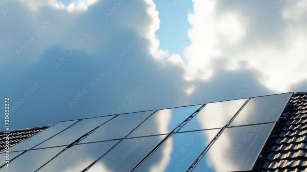 Time lapse of clouds and sky reflectiing in solar panels on a roof of a residential house.