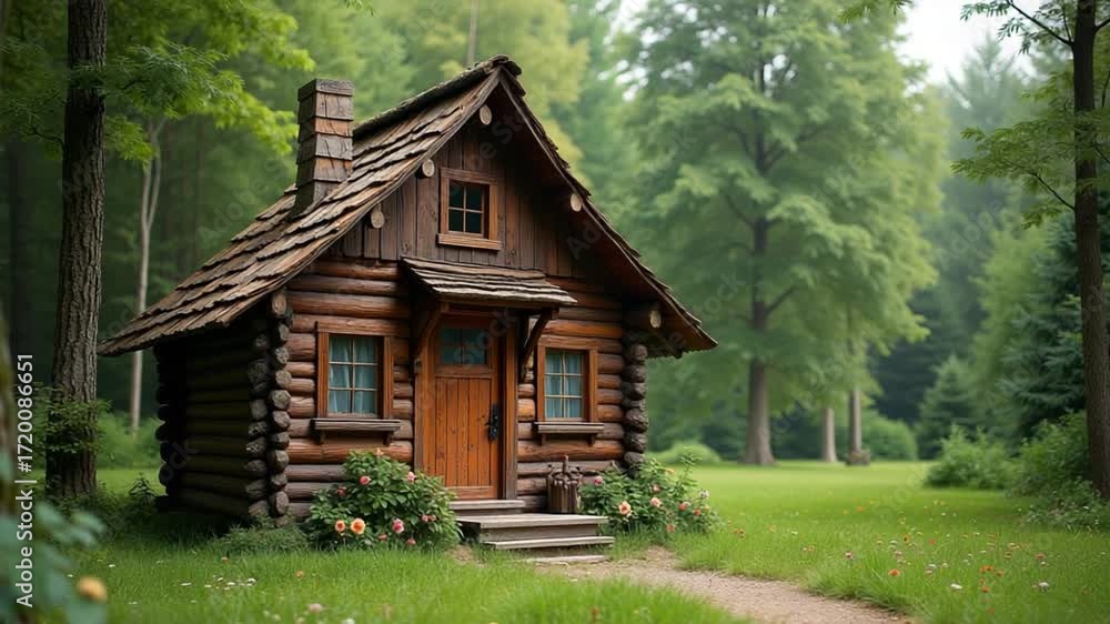 Details of a summer park with traditional russian fairytale wooden houses surrounded