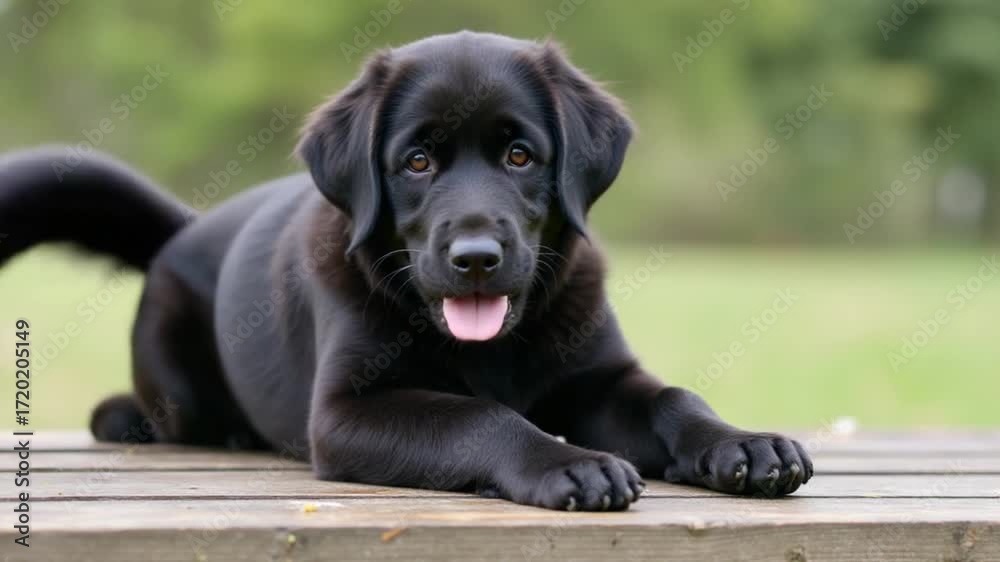 Small Black Dog Resting on Wooden Bench in Natural Setting
