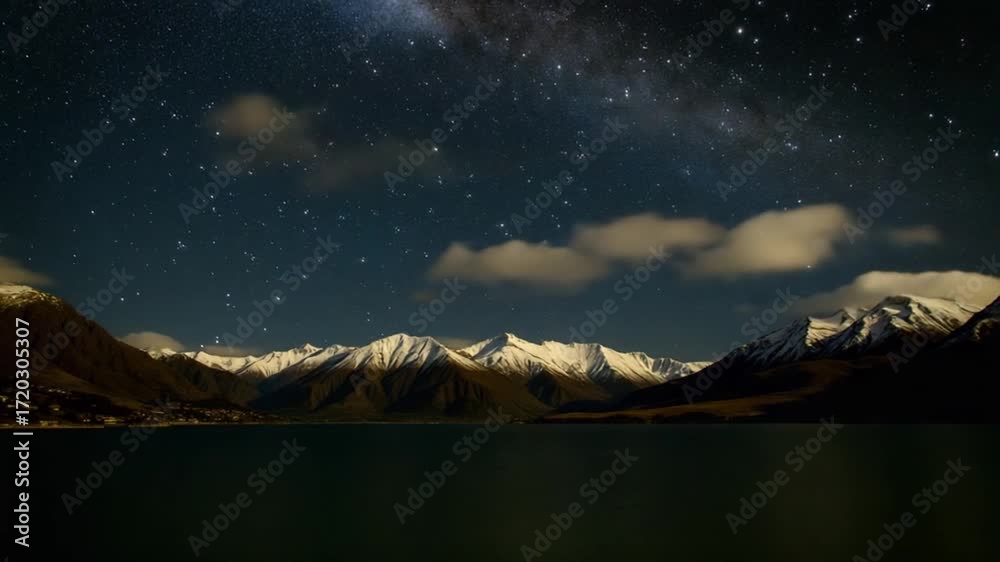 A serene night view of snow-capped mountains under a starry sky in Queenstown, New Zealand