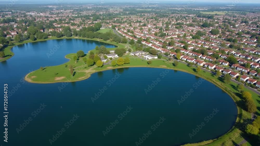Aerial view of a serene lake and suburban area, Scenic aerial view of a large lake surrounded